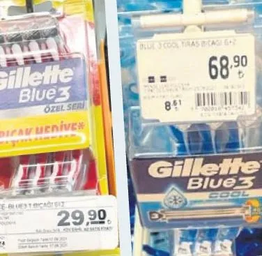 Aynı tıraş bıçağı... Gillette Blue 3... Özel seri... 6+2... Etiket... "29.90."
