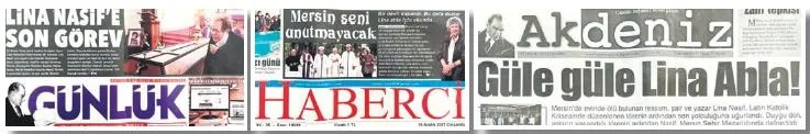 Yerel medya... Ölümünü, cenazesini, "Manşetten verdi." Cenazesinde... "Herkes vardı... Gözyaşı sel oldu, aktı." Büyükşehir Belediye Başkanı Vahap Seçer, tabutunun üzerine Türk bayrağı örttü. Lina... Türkiye'ye... Mersin'e âşıktı... Şimdi âşık olduğu şehirde, sonsuzluk uykusunda yatıyor.