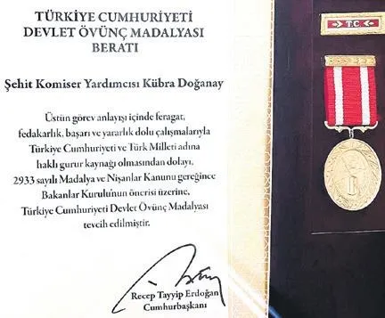 Beratın üzerinde, "Şehit Komiser Yardımcısı Kübra Doğanay" yazılı.