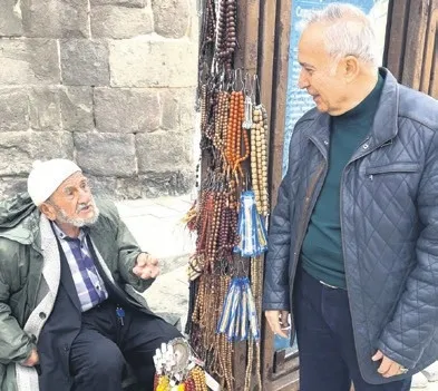 Hunat Hatun Külliyesi... Selçuklu mirası... Şimdi çarşı... Şehir merkezinde. Mekânın önünde... Kaldırımda... 40 yıllık bir tespihçi var... Kayseri'nin tespihçi Mehmet amcası.