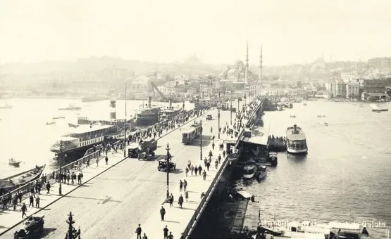 Galata Köprüsü'nde Otomobil ve Tramvay.