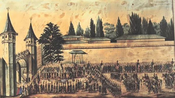 Osmanlı sarayındaki bayramlaşmanın nasıl yapılacağı "Fatih Kanunnamesi" ile belirlenmişti. Kanunnameye göre padişah bayram günü sabah namazını Hırka-i Saadet Dairesi'nde kılar, daha sonra dairenin önüne taht konulurdu. Padişah tahta oturunca orada bulunan hocalar aşr-ı şerif okurlar, ardından görevliler bunlara hediyelerini verirlerdi.