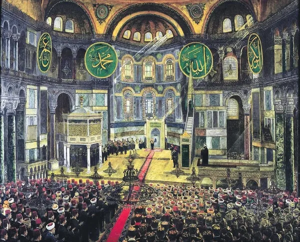 Fatih, kubbeden indikten sonra Ayasofya içinde fetih ezanı okuttu ve kendisi mabedin "apsis" kısmına geçerek burada şükür namazı kıldı. Evliyâ Çelebi ise Ayasofya'daki ilk fetih ezanını bizzat Fatih'in okuduğunu ve mihraba sancak dikildiğini rivayet eder.