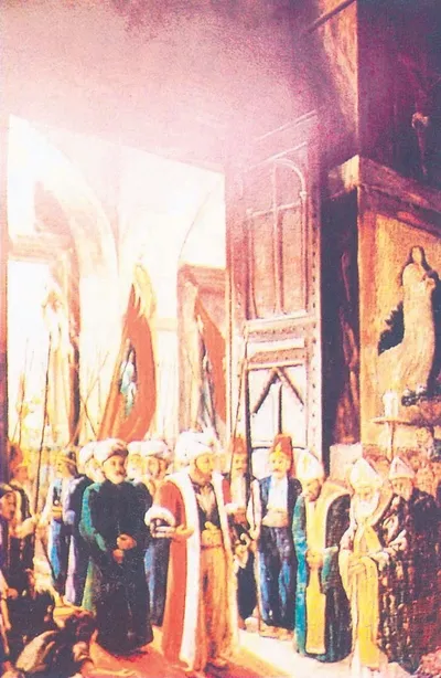 İstanbul 29 Mayıs 1453 Salı günü fethedildi. Fetihle birlikte Fatih unvanını kazanan İkinci Mehmed, şehre askerleri ve devlet adamlarıyla beraber aynı gün girdi. Genç sultan çevreyi seyrederek Ayasofya'ya kadar atı üzerinde ilerledi. Ayasofya'nın önünde atından indi ve içeriye girdi. Ayasofya'nın içine girdiğinde burada bir askerin duvarlardaki mermerlere zarar verdiğini görüp duruma müdahale etti.