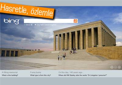 Bugün 10 Kasım, yani Atatürk'ün aramızdan ayrılmasının 73. yılı. Atamızı hasretle, saygıyla özlemle anıyoruz. Fakat acımıza ve özlemimize ortak olan ve Atamıza saygısını gösteren Bing'e ve Microsoft'a ayrı bir teşekkür etmek istiyorum buradan. Tamam, belki favori arama motorumuz Google, fakat Bing'in bugünkü anasayfasını da görmenizi isterim. Ayrıca Google gibi Türkiye'ye özel değil, Bing'in İngiltere görünümü de bu şekilde. Google da tabii ki unutmamış bizler için önemli olan bu günü, ana sayfasına bir adet karanfil yerleştirmiş.