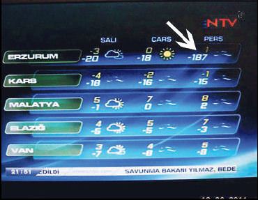 O seyahatimden sonra hava durumu bültenlerinde Erzurum'un havasına dikkat eder oldum. Önceki gün NTV'nin bülteninde Erzurum'daki en düşük hava sıcaklığını görünce şok geçirdim. '-187 derece' yazıyordu Erzurum'un soğuğunu anlatmak için "Kediler damdan dama atlarken havada donup kalır" derler. NTV'nin hatası, bu geyiği bile geride bırakacak cinstendi!