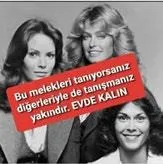 Şahane mesaj içeren bu görsele sosyal medyada rastladım. Charlie'nin Melekleri dizisinin altına "Bu melekleri tanıyorsanız, diğerleriyle de tanışmanız yakındır. Evde kalın" yazılmış.