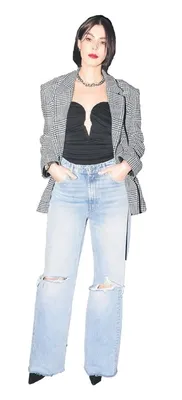 Ekoseli blazer ceketi, içindeki büstiyeri ve zincir kolyesi mükemmel bir bütünlük yaratmış. Ancak seçtiği jean ile tüm bu güzel görüntü bozulmuş. Oysa; diz kısmı yırtık, açık renk, bol kesim bu jean yerine, siyah deri bir pantolon veya koyu bir jean tercih etseydi harika bir görüntü ortaya çıkacaktı.