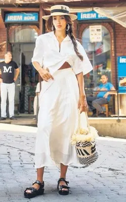 Kumaş pantolon, deri büstiyer uyumu da gayet iyi ancak üçü bir araya gelince olmamış! Ya ceketi daha spor bir kesim tercih emeliydi ya da büstiyeri deri değil kumaş olmalıydı.