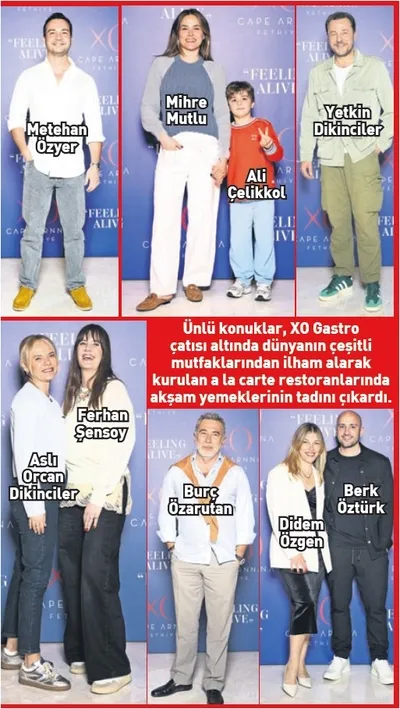 Ünlüler arasında; Eda-Ferhat Zamanpur, Ege Kökenli-Lior Ahituv, Yetkin-Aslı Dikinciler, Hakan Sabancı, Dağhan-Dila Tarkan Doğruer, Mihre Mutlu, Seda Bakan, Saadet Işıl Aksoy, Ferhan Şensoy ve Esra Ruşan ilk gözüme çarpanlardı. Çoluk çocuk Fethiye'ye gelenler, otelin hazırladığı açılış programıyla çok keyifli zaman geçirdi. İlk gün 23 Nisan kutlandı. Otelin merkezinde yer alan Kral Yolu'nda yapılan Türk bayraklı kortej, ünlü isimler ve çocuklarının katılımıyla bayramın ruhunu en güzel şekilde yansıttı. Akşamında da otelin lobisinde, muhteşem bir manzara eşliğinde gerçekleşen 'Welcome Party'de buluşan ünlüler, dolu dolu bir gün geçirmiş oldu. Bu arada partiye katılan konukların şıklıkları gözümden kaçmadı.