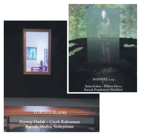 Sergide üç yönetmenin, sektörün farklı alanlarında emek veren isimlerle ortak işleri yer alıyor. Yönetmen Reha Erdem'le uzun yıllardır birlikte çalıştığı görüntü yönetmeni Florent Herry'nin 'Mimirap' adlı çalışması, Erdem'in 'Koca Dünya' (2016) filminden yola çıkıyor ve sergiye özel çekilen bir sekanstan oluşuyor. Filmin başrolündeki Ecem Uzun'un Erdem'in kaleme almış olduğu bir rap şarkısını seslendirdiği çalışma, döngüsel bir 'gösteri kutusu' olarak tanımlanıyor. Yönetmen Zeynep Dadak'la yıllardır ortak işlere imza attığı kurgucu Çiçek Kahraman da 'Vortex 1' ve 'Vortex 2' çalışmalarıyla sergide yer alıyor. Dadak'ın 'Ah Gözel İstanbul' (2020) filmiyle birlikte Alfred Hitchcock'un 'Ölüm Korkusu' (Vertigo, 1958), Derek Jarman'ın 'Blue' (Mavi, 1993) ve Agnès Varda'nın 'Agnès'in Plajları' (Les Plages d'Agnès, 2008) filmlerini hareket noktası kabul eden ikili, çalışmalarında sinemanın yutan, içine çeken hâlini, yarattıkları akışkan ve girdapvari yeni kurgular üzerinden yorumluyor. Yönetmen Deniz Tortum'la birlikte çalıştığı ses tasarımcısı Alican Çamcı'nın 'Kesit' adını taşıyan işleri ise Tortum imzalı 'Maddenin Halleri' (2020) filmini odağına alıyor. 'Kesit', filmin kendi kurgusal akışını mekân ile bütünleyen ve tıpkı filmin çekimlerinde olduğu gibi, içine çekerek yabancılaştıran, kendi zamansal boyutuna hapsolmuş bir alan deneyimi sunuyor. Sergi kapsamında Lara Kamhi'nin 'Video Essay' adlı eseri de seyirciyle buluşacak. Sergi 29 Haziran'a kadar açık.