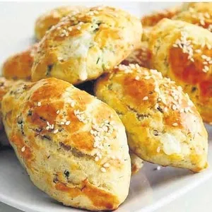 Tüm malzemeyi iyice yoğurup şekil veriyoruz. Üzerlerine yumurta sarısı sürüp çörek otu ya da susam ile süslüyoruz. 180 derecede 30 dakika pişiriyoruz.
