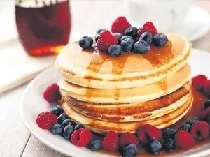 YAPILIŞI: Yumurta, süt, şeker ve pudra şekerini pürüzsüz bir kıvam alana kadar çırpıyoruz. Ardından yavaş yavaş elenmiş unu ve kabartma tozunu ekliyoruz. Hazırlanan hamurdan kepçe yardımıyla teflon tavaya döküyoruz, orta derecedeki ateşte, iki yüzünü de pişiriyoruz. Mevsim meyvelerini ince ince doğruyoruz. Pankekleri, aralarına meyveleri koyarak kat kat diziyoruz. Son olarak üzerine akçaağaç şurubunu döküp servis ediyoruz.