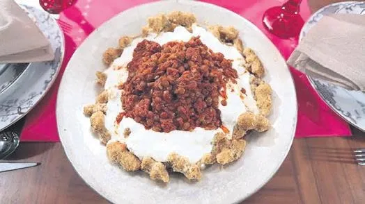 YAPILIŞI: Bulgura 2 su bardağı kaynar suyu ve biraz tuzu ekleyip çok kısık ateşte pişirin. Piştikten sonra sıcakken tepsiye döküp 2 su bardağı un ekleyin, 1 yumurta kırıp yoğurun. Resimdeki gibi köfte şekli verip kaynar suda mantı gibi haşlayın. Kaynama suyuna da tuz ekleyin. Sosu için soğanları küp küp doğrayıp kızartın. Yeşil mercimekleri de haşlayın. Kıymayı kavurup içine salça soğan ve mercimeğini ekleyin. Gilloru servis tabağına alın, üzerine sarımsaklı yoğurt dökün, en üstüne de sosunu döküp servis yapın.