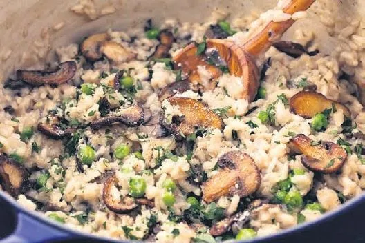YAPILIŞI: Sarımsak ve soğanı ince kıyıp tereyağında kavuruyoruz. Pirinci ilave edip sürekli karıştırarak beş dakika boyunca kavurmaya devam ediyoruz. İnce doğranmış mantarları ekleyip karıştırıyoruz. Hindi suyundan kepçe ile yavaş yavaş ilave edip pirince çektiriyoruz. Pirinç yumuşayınca ocaktan alıyoruz. Servis tabağına alıp üzerine rendelenmiş eski kaşar peyniri serpiyoruz. Kızarmış biberiye ile süsleyerek servis yapıyoruz.