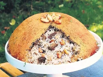 YAPILIŞI: Tereyağı ve sıvı yağda soğanı kavuruyoruz. Yıkanan pirinçleri ekleyip 5 dakika kavuruyoruz. Sırasıyla badem, kuş üzümü ve kuru üzüm koyuyoruz. Tuz, şeker ve tarçın ekleyip, suyu ilave ediyoruz. 1 çay bardağı sıcak suda zerdeçalı karıştırıp onu da tencereye döküp pişiriyoruz. 100 gram tereyağını eritiyoruz. Kadayıfla harmanlıyoruz. Cam fırın kabına kadayıfları döşüyoruz. Pilavı kadayıfların içine boşaltıyoruz. Üstünü folyoyla kapatıyoruz. 180 derecede kadayıfları kızarana kadar pişiriyoruz.