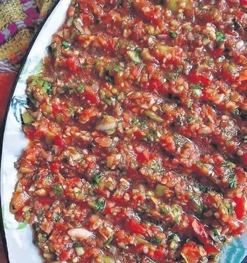 YAPILIŞI: Ayıklanıp yıkanan sebzeler, tavla zarından küçük doğranır. Domatesler de aynı şekilde doğranıp ilave edilir. İçerisine pul biber, nane ve ekşiler de konup zeytinyağı ve tuz eklenir.