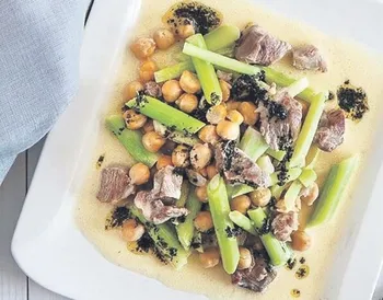 YAPILIŞI: Öncelikle eti düdüklü tencerede haşlıyoruz. Yeşil sarımsakların yeşil sap kısımlarına kesiyoruz, pırasaları da aynı şekilde kesip suya koyuyoruz. Birkaç kez suyunu döküp tekrar suda bekletiyoruz. Pişen etleri düdüklü tencereden çıkartıyoruz, et suyunu süzüp tekrar düdüklü tencereye koyup içine doğramış suda bekletilmiş sarımsak ve pırasayı süzerek koyarak 10 dakika pişiriyoruz. Pişen sebzelerin içine nohut ve etleri koyup tuzunu ayarlıyoruz.