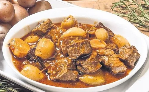 YAPILIŞI: Kuşbaşı etleri, kapaklı bir güveçte orta ateşte kendi suyunu salıp çekene kadar pişiriyoruz. Suyunu çekince sıvı yağ ekliyoruz. İçine küp küp doğranmış patates ve soyulmuş arpacık soğanları ilave edip kavuruyoruz. Salça ekleyip kavurmaya devam ediyoruz. Ardından sakızı ve diğer malzemeleri de koyduktan sonra üzerini geçecek kadar kaynar su ilave edip kapağını kapatıyoruz. Patatesler pişince ocaktan alıp servis ediyoruz.