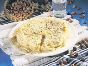YAPILIŞI: Önce şerbetimizi hazırlıyoruz. Şeker ve suyu 7 dakika kaynatıyoruz, kapatmaya yakın limon sıkıp soğumaya bırakıyoruz. Kuru yufkaları birer birer ıslatıyoruz, kızartma tavamıza biraz sıvı yağ koyup altını açıyoruz ve yufkalar yumuşayınca iki yufkayı tavamıza serip pişiriyoruz. Ardından kapak yardımı ile çevirip diğer tarafını da pişiriyoruz. Daha sonra arasına biraz tereyağı sürüp, fındık serpiyoruz, üzerine iki adet daha yufka serip yine kapak yardımı ile çeviriyoruz. Pişen tarafına aynı şekilde tereyağı ve fındık serip, ıslatılmış son iki yufkayı da en üste serdikten sonra altını ve üstünü kızartıyoruz. Daha sonra bir tepsiye alıp kesiyoruz. Ilık olunca hazırladığımız şerbeti üzerine döküyoruz. 1-2 saat sonra tatlımız hazır.