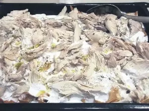 YAPILIŞI: Yufkayı un, su ve tuzla yoğurduktan sonra ince açarak sacda pişirebilirsiniz. Ya da tarifteki gibi hazır yufka da kullanabilirsiniz. Yufkayı rulo şeklinde sarıp, 2 parmak kalınlığında keserek tepsiye diziyoruz. Ardından yufkaları fırında kızartıyoruz. Diğer taraftan tavuğu haşlayıp didikliyoruz. Suyu biraz ısıtıp içine bol sarımsak ekliyoruz. Ardından tuz ekliyoruz. Tavuk suyunu yavaş yavaş yufkaların üstünde gezdiriyoruz. Yufkalar yumuşayana kadar bu işlemi yapıyoruz. Hamur olmaması için birden çokça dökmeyin. Son olarak üstüne didiklediğimiz tavukları ekliyoruz.
