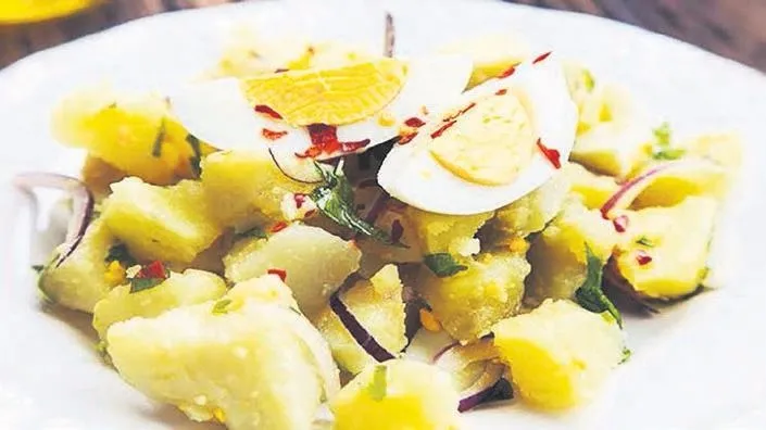 YAPILIŞI: Patatesler haşlanır, kabukları soyularak iri küp halinde doğranır. Soğanlar soyulup piyazlık dilimlenerek tuzla acısı alınır. Haşlanmış yumurta ve maydanoz içine doğranır, limon, tuz, zeytinyağı, biraz karabiber ve pulbiber ile karıştırılır.