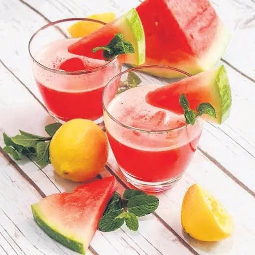 YAPILIŞI: Limon ve portakalların kabuklarını rendeliyoruz. Limon ve portakalın kalan kısmını küp küp dilimliyoruz. Taze naneyi incecik doğruyoruz. Tüm malzemenin üzerine toz şeker ve iki su bardağı su döküp bekletiyoruz. Şeker eriyip limonata malzemesi özleşince, tel süzgeç ya da tülbentten soğuk su ilavesi ile geçiriyoruz. Karpuzu rondoda çekip, limonataya ekledikten sonra hepsini süzgeçten geçirip sulandırıyoruz.