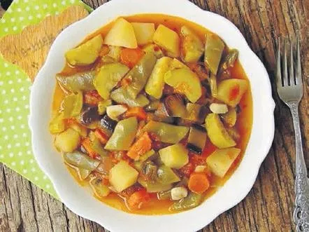 YAPILIŞI: Öncelikle patlıcanları al al soyuyoruz. Daha sonra 2'ye ya da 3'e bölüp, parçaları 2'ye ayırıyoruz ve uzun uzun doğrayıp tuzlu suda bekletiyoruz. Biber, patates, soğan ve fasulyeyi de doğruyoruz. Bir tencereye sıvı yağ koyuyoruz ve yemeklik doğradığımız soğanları ekliyoruz. Soğanlar pembeleşene kadar pişiriyoruz. Daha sonra salçayı bir kaseye alıp sıcak su ile açıyoruz ve soğanların üzerine ekliyoruz. Ardından sebzeleri tencereye alıp salçayla karıştırıyoruz ve sıcak su ilave ediyoruz. Baharatları ekleyerek tencerenin ağzını kapatıyoruz. Orta ateşte yaklaşık 30 dakika pişiriyoruz.