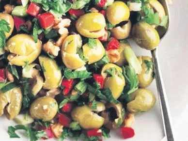 YAPILIŞI: Yeşil zeytini geniş bir servis tabağına alın. İnce kıydığınız maydanoz, taze soğan, kırmızı kapya biberi ve iri çekilmiş cevizi ilave edip harmanlayın. Sosu için gerekli olan tüm malzemeyi bir kasede karıştırıp piyazın üzerine gezdirin. Karıştırıp servis yapın.