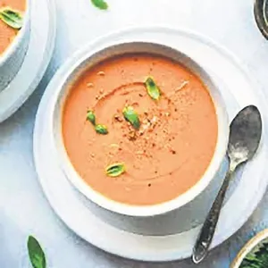YAPILIŞI: Önce domatesleri blender'dan geçiriyoruz. Salatalık, soğan ve sarımsağı eziyoruz. Sebze suyu, limon, sirke, tuz ve karabiberi ilave ederek karıştırıyoruz. Kırmızı biber ve fesleğen yaprakları ile süsleyerek servis ediyoruz.