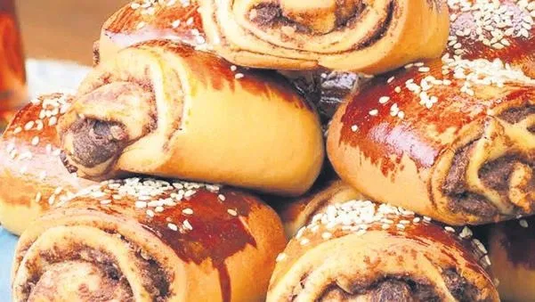 YAPILIŞI: Hamur için; tüm malzemeyi karıştırıyoruz ve unu azar azar ilave ediyoruz. Kulak memesi yumuşaklığında bir hamur olana dek yoğuruyoruz. Üzerini nemli bir bez ile örtüp mayalanmaya bırakıyoruz. İç malzemeyi yoğuruyoruz, minik toplar halinde yuvarlıyoruz. Mayalanan hamurdan bezeler kopartıp yuvarlıyoruz. Elimizle veya bir merdane yardımıyla uzun ince açıyoruz. Ortasına, top haline getirdiğimiz iç malzemeyi koyup üçgen şeklinde kapatıp ay şekli veriyoruz. Üzerlerine yumurta sarısı sürüyoruz, önceden ısıtılmış 180 derecelik fırında kızarana kadar pişiriyoruz.
