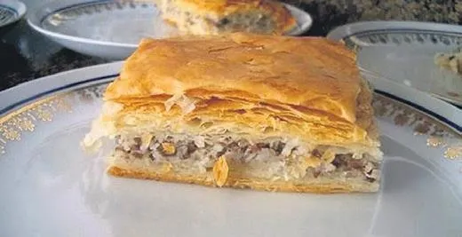 YAPILIŞI: Hamur için verilen malzemeleri karıştırıp, yumuşak bir hamur elde edene kadar yoğuruyoruz. Yoğurduğumuz hamuru 8 eşit parçaya ayırıp yumak yaptıktan sonra üstünü ıslak bezle örtüp 30 dakika bekletiyoruz. Bu arada pilici haşlayıp kemiklerinden ayırarak iri iri parçalıyoruz. Diğer tarafta zeytinyağında önce bademleri kızartıp bir tabağa aldıktan sonra aynı yağda soğanı kavuruyoruz. Haşlanmış pirinç ilave ederek 1-2 dakika karıştırıyoruz. Ardından 3 bardak tavuk suyu ekleyip pilav gibi pişiriyoruz. Suyunu çekince üzerine diğer iç malzemeleri koyuyoruz. Yoğurduğumuz hamuru baklava usulü, nişasta ve un ile tek tek açıyoruz. Dört yufkayı aralarını yağlayarak tepsiye döşüyoruz. Ortasına hazırladığımız içi koyuyoruz. Diğer dört yufkayı da aralarını yağlayarak tepsiye koyuyoruz. Alttan taşan yufkaların kenarlarını kıvırarak kapatıyoruz. Üzerini yağlayıp sıcak fırında üstü pembeleşinceye kadar pişiriyoruz