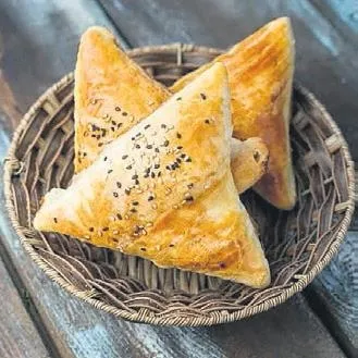 YAPILIŞI: Hamur için; elenmiş una, ılık su ve tuz ekleyerek yoğuruyoruz. Ara ara un ilave ederek ne sert ne de yumuşak olan bir hamur elde ediyoruz. 35-50 dakika oda sıcaklığında üzeri kapalı olarak dinlendirdiğimiz hamuru dört bezeye ayırıyoruz. Bezeleri yarım santim kalınlığında açıyoruz ve üzerine yağ gezdiriyoruz. Rulo şeklinde sarıp tahmini dört parmak genişliğinde dilimlere bölüyoruz. Tepsiye dizip 40-60 dakika buzdolabında bekletiyoruz. İç harç için; kıyma, ince ince doğranmış soğan, tuz ve karabiberi karıştırıyoruz. Buzdolabına koyduğumuz hamuru çıkarıp bir santim kalınlığında açıyoruz ve hazırladığımız iç harçtan 1-2 çay kaşığı koyup üçgen şekli veriyoruz. Bitiştirdiğimiz hamur uçlarını alt tarafa çeviriyoruz. Tepsiye dizip üzerine yumurta sarısı karışım sürüyoruz. Çörek otu, künçüt serpip önceden ısıtılmış 180-200 derecelik fırında 25- 30 dakika pişiriyoruz.