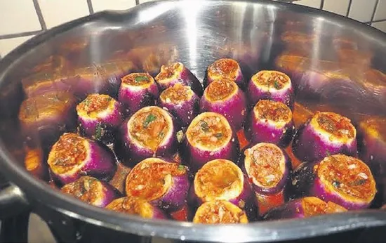 YAPILIŞI: Sos için soğanı kıyıp zeytinyağında pembeleşene dek kavurun. Doğranmış sarımsak ekleyip karıştırın. Kabukları soyulup küçük doğranmış domates ilave edin. Ardından kıyılmış biber katın. Salçaları, kesme şekeri, tuz ve karabiberi ekleyip pişirin. Ocaktan alıp kıyılmış maydanoz ilave edin ve karıştırın. Ayrı bir yerde kırmızı biberleri yıkayıp kuruladıktan sonra sıvı yağda kızartın. Patlıcanları alacalı soyup küp küp doğrayın. Kalan sebzeleri de küp küp doğrayıp, ayrı ayrı sıvı yağda kızartın ve fazla yağını almak için kağıt havlu üzerine çıkarın. Sosla karıştırıp kenara alın. Kırmızı biberleri bıçak yardımıyla boylamasına ortadan kesin. Kesme sırasında iki parçanın kopmamasına dikkat edin. Çekirdek yataklarını çıkarıp, ortalarına sebzeli soslu karışımı pay edin.
