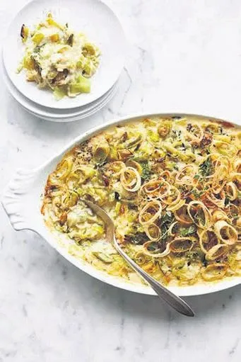 YAPILIŞI: Geniş bir tencereye sıvı yağ koyup üzerine sebzeleri pişme sırasına göre ilave edelim. Önce yemeklik doğranmış kuru soğanı, peşinden kapya biberi ve havucu ilave edelim. Sebzeler diriliğini kaybettiğinde isteğe bağlı biraz da pul biber ekleyelim. Son olarak ince doğranmış pırasayı ilave edip tencerenin kapağını kapatmadan kısık ateşte pişirelim. Pırasa hazır olduktan sonra beşamel sosu hazırlayalım. Uygun bir tencereye sıvı yağı ve tereyağını alıp eritelim, üzerlerine 2 yemek kaşığı un ekleyip unun kokusu çıkana kadar karıştıralım. Üzerine 2 su bardağı sütü azar azar ilave edip sürekli çırpıcıyla çırpalım. Sosumuz kıvam almaya başladığında üzerine biraz tuz ve karabiber ekleyip karıştıralım. Hazır olan sosu ocaktan alalım. Uygun bir tepsiye veya borcama pırasa yemeğini yayalım. Üzerine önce beşamel sosu sonra ise kaşar peynirini gezdirelim. Ve yemeğimizi 200 derece fırında üzeri kızarıncaya dek pişirelim.