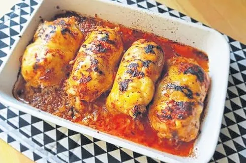 YAPILIŞI: Pirinci, ılık tuzlu suda 30 dakika bekletiyoruz. Zeytinyağında dolmalık fıstığı rengi dönene kadar kavuruyoruz. Soğan ekleyip pembeleşene dek kavurmaya devam ediyoruz. Pirinci ekleyip 10 dakika kavurduktan sonra kuş üzümü, yenibahar, nane, karabiber ve tuzu ilave ediyoruz. Suyu ekliyoruz ve suyunu çekene kadar pişiriyoruz. Ayrı bir yerde 1 adet açılmış tavuk budunu derisi dışarıda kalacak şekilde bir kasenin içine yerleştiriyoruz. Ortasına pilav koyup kenarda kalan tavuk parçalarını ortada birleştiriyoruz, ters çevirip fırın tepsisine alıyoruz. Domates salçasını suda açıp üzerine zeytinyağı ile sıvı yağ ekleyip karıştırıyoruz. Tuz ve karabiber ekleyip sosu tavukların üzerine gezdiriyoruz. Önceden ısıtılmış 200 derece fırında kızarana kadar pişiriyoruz.