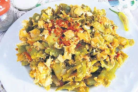 Ayıklanmış fasulye, kaynar suda biraz yumuşayana kadar haşlanıp süzülür. Tavaya zeytinyağı koyulur, soğanlar pembeleşene kadar kavrulur, pul biber eklenir. Fasulyeler tavaya alınır, tuz serpilir ve soğanla beraber kavrulup tereyağı eklenir. Yumurtalar karıştırılıp fasulyenin üzerine yayılır. Yumurtalar piştiğinde yemek hazır demektir.