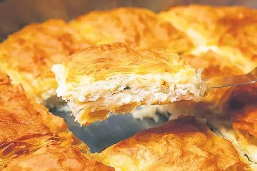YAPILIŞI: Hamurun bütün malzemeleri eklenir. Kulak memesi yumuşaklığında bir hamur elde edilir. Minik bezeler haline getirilir. Üzeri bez ile kapatılır. Biraz bekletilir. Bezeler tek tek bol un ve nişasta karışımı ile açılacaklar. Açılan bezeler 3'e ayrılır. 3 beze tek tek bir seferde açılır. Tepsinin altı tereyağı ile yağlanır. İlk hamur katı serilir. Üstüne fındık dökülür ve az tereyağı sürülür. Aynı işlem diğer hamur katlarına da yapılır. Bardak yardımı ile şekil şekil kesilir. Üzerine bol tereyağı dökülüp fırında 180 derecede üzeri hafif kızarana kadar pişirilir. Börek pişerken süt şerbeti hazırlanır. Süt ve şeker kaynatılır. Börek piştikten sonra süt börekten sıcak olacak şekilde ayarlanıp üzerine dökülür.