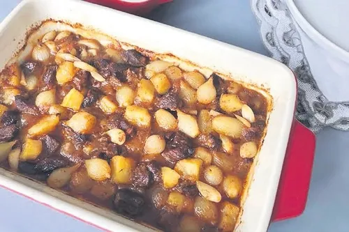 YAPILIŞI: Kuşbaşı etleri, kapaklı bir güveçte orta ateşte kendi suyunu salıp çekene kadar pişiriyoruz. Suyunu çekince sıvı yağ ekliyoruz. İçine küp küp doğranmış patates ve soyulmuş arpacık soğanları ilave edip kavuruyoruz. Salça ekleyip kavurmaya devam ediyoruz. Ardından sakızı ve diğer malzemeleri de koyduktan sonra üzerini geçecek kadar kaynar su ilave edip kapağını kapatıyoruz. Patatesler pişince ocaktan alıp servis ediyoruz.