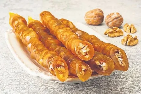 YAPILIŞI: Önce cevizleri hazırlayalım. Bir cevizi bıçak yardımı ile dörde bölelim. Sonra yorgan ipinden yaklaşık bir metre kadar kesip iğneye takalım. Daha sonra cevizler bitene kadar, tek tek iplere dizelim. Geniş bir tencerenin içine pekmez ve suyu alalım.