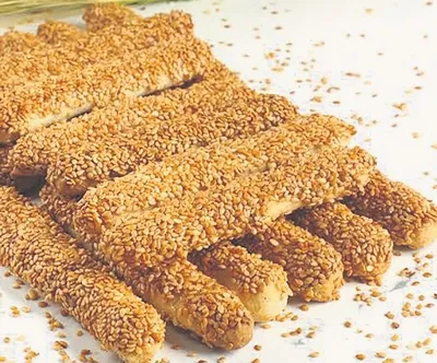 Yumurtayı çırpıyoruz, içine pekmezi de ekleyip karıştırıyoruz. Hamurun üzerine fırçayla yumurtalı karışımdan sürüyoruz, bolca susam serpiştiriyoruz. Susamların hamura yapışması için elimizle hafifçe üzerine bastırıyoruz. Buzdolabına kaldırıp bir saat dinlendiriyoruz. Hamuru bir santim genişliğinde şeritler halinde kesiyoruz, kestiğimiz şeritlerin aralarında ikişer santim kalacak şekilde boşluk bırakıp tepsiye yerleştiriyoruz. Fırını 180 dereceye ayarlayıp 15-20 dakika ısıttıktan sonra tepsiyi fırına sürüyoruz. Rengi altın sarısı olana kadar pişiriyoruz.