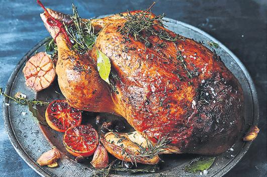 YAPILIŞI: Kaynayan suyun içine tuz, şeker, limon kabuğu rendesi ile limonun suyu, mandalina kabuğu rendesi ile suyunu ve diğer tüm malzemeyi ekliyoruz. Kaynattıktan sonra soğutuyoruz. Salamura sosunu bir kovaya döküp, temizlenmiş bütün hindiyi içine daldırıyoruz. 24 saat bekledikten sonra yıkıyoruz ve pişirmeye hazır hale getiriyoruz. Temizlenmiş hindinin içini kuru soğan, limon ve bir adet defne yaprağı ile dolduruyoruz. Pişirmek içinse tereyağını çeşnilendirip, hindi eti ile derisi arasındaki katmana masaj yaparak her tarafına gelecek şekilde iyice yayıyoruz. Diğer yandan pişerken derisinin yanmaması için, tereyağını çeşnilendirdiğimiz karışımdan aynı ölçüde hazırlıyoruz ve eritiyoruz. Bir tane gazlı bezi bu sosa iyice buladıktan sonra hindinin etrafını gazlı bezle örtüyoruz. Önceden ısıtılmış 180 derecelik fırında iki saat pişirdikten sonra gazlı bezi çıkartıyoruz ve folyo ile kaplayıp bir saat daha pişiriyoruz. Bu arada yarım saatte bir hindiyi çıkartıp tepside biriken sosu üzerine döküyoruz ve hep yumuşak kalmasını sağlıyoruz.