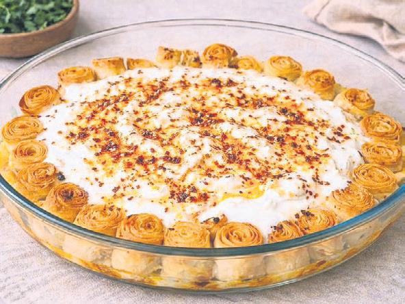 YAPILIŞI: Yufkaları rulo şeklinde sarıp iki parmak genişliğinde kesiyoruz. Cam bir fırın kabına dik şekilde diziyoruz. Önceden ısıtılmış 175 derecelik fırında pişiriyoruz. Sıcakken sütü üzerine gezdiriyoruz. Sarımsaklı yoğurdu üzerine döküyoruz. Biberli tereyağını da dökerek servis ediyoruz.