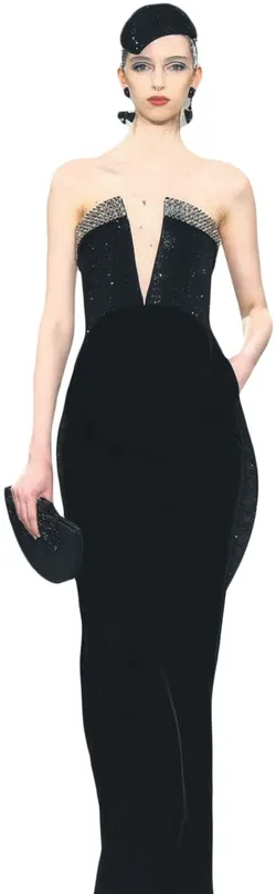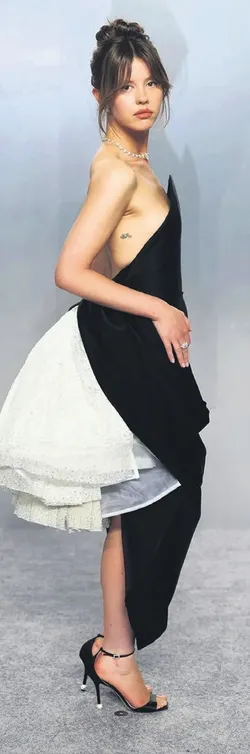 Odessa A'zion ise Valentino'nun daha karanlık, daha bohem yüzünü taşıdı. Michele'in 2026 ilkbahar haute couture Specula Mundi koleksiyonundan seçilen görünümde, geniş yakalı yumuşak yapılı bir üst, siyah kadife çiçek işlemeleri ve gümüş kristallerle hareketleniyordu. Buna siyah kadife pantolon ve yine kadife bir kuşak eşlik ediyordu.