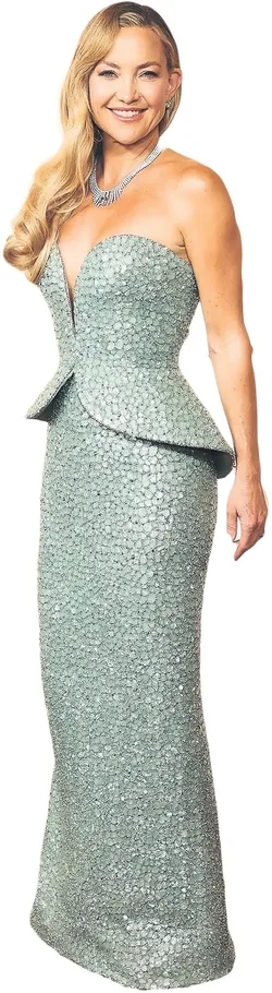 Kate Hudson'ın açık yeşil tonlarındaki, taş ve kristal işlemelerle kaplı elbisesi; derin kalp yaka, peplum bel ve güçlü silüetiyle markanın o tanıdık zarafet anlayışını yeniden görünür kıldı. Giorgio Armani'nin ölümünün ardından ilk couture sunumuna imza atan Silvana Armani'nin daha kadınsı ve daha sağlam duran bakışı da bu seçimde hissediliyordu.