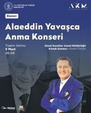 Güzel Sanatlar Müdürlüğü tarafından düzenlenen 'Alaeddin Yavaşca Anma Konseri', İstanbul Tarihi Türk Müziği Topluluğu tarafından, Türk sanat müziği sahnesinin önemli isimlerinden Ahmet Özhan'ın konuk sanatçı olarak katılımıyla icra edilecek. İstanbul Tarihi Türk Müziği Topluluğu eşliğinde sahneye çıkacak olan Ahmet Özhan, Ümitsiz Bir Aşka Düştüm, Artık Bu Solan Bahçede, Geçmesin Günümüz Sevgilim Yasla gibi hafızalarda yer etmiş 18 eseri sanatseverlerin beğenisine sunacak.