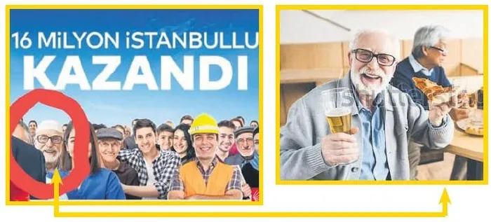 Ekrem İmamoğlu'nun dijital afişi tüm sosyal medyada çalkalanıyor. Reklam ve dijital ajansların gözdesi olan Shutterstock adlı platformdan, elinde içki ve pizza bulunan yaşlı birinin fotoğrafı alınmış, sonra bu kişinin kafasına takke geçirilip afişte kullanılmış. Bu durum, İmamoğlu'nu oldukça komik bir hale düşürdü.