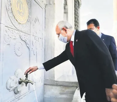 CHP Başkanı Kemal Kılıçdaroğlu ve heyeti, 'musluk' açtı, Türk siyaseti böyle açılış görmedi. Güler misin ağlar mısın? Musluk değil, sanki baraj açılıyor! Sultanahmet'teki 3. Ahmed Çeşmesi'nin açılışını yapan da sanki Kılıçdaroğlu değil, 3. Ahmet!