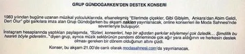 1983 yılından bugüne uzanan müzikal yolculuklarında 'Ellerimde Çiçekler', 'Gibi Gibiyim', 'Ankara'dan Abim Geldi', 'Dert Olur' gibi şarkılara imza atan Grup Gündoğarken, geçtiğimiz hafta içi Modasahnesi.com'da online konser verdi. İsteyenler siteye girip bilet alarak konseri seyretti. Buraya kadar her şey normal. Anormal olan şey ise konser öncesinde basına servis edilen haber bülteni... Gelen e-mail'de haberin başlığı 'Grup Gündoğarken'den destek konseri' diye büyük puntolarla yazılıydı. Alt satırlarda da 'Grup Gündoğarken, müzik sektörününün pandemi döneminde çok ağır yara aldığını ve herkesin destek olması gereken bir dönem olduğunun altını çizdi' diye yazıyordu. Destek konseri deyince herkes heyecanla müzik camiasında aylardır iş alamayan müzisyenler için bir gecenin düzenleneceğini düşündü. Fakat işin öyle olmadığı anlaşıldı... Buradaki destek; Burhan Şeşen ve Gökhan Şeşen içindi...
