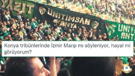 Fenerbahçe'yi konuk eden Konyasporlu taraftarların tribünde İzmir Marşı'nı seslendirmesi sosyal medyada gündem oldu. "Konya tribünlerinde İzmir Marşı mı söyleniyor? Hayal mi görüyorum?" benzeri yorumlar yapıldı.